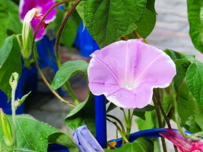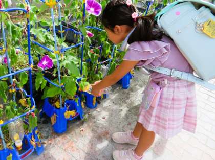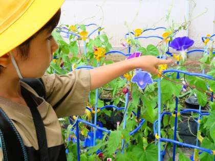 登校後にアサガオの水やりをしている1年生から「校長先生、○○さんの、花が咲いている!」と嬉しそうな声が聞こえてきました。自分のだけでなく、友達のアサガオにも目を向けています。