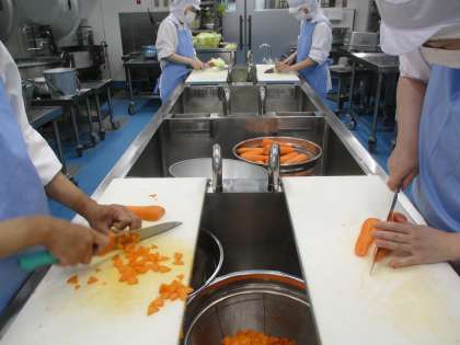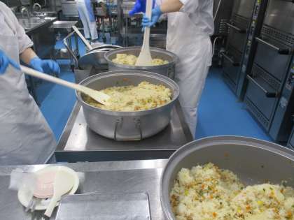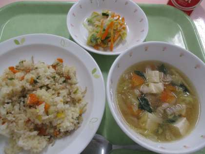 今日は「じゃこ入りチャーハン」です。じゃこ・豚ひき肉・ピーマンを使用して作っています。じゃこは骨を強くするカルシウムが多く含まれています。よく嚙んで美味しくいただけるといいですね。