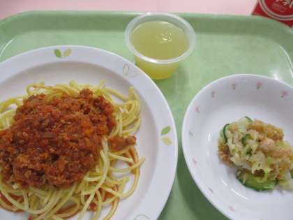 今日は「スパゲッティミートソース」です。豚ひき肉・玉葱・マッシュルーム・を使用して作っています。サラダにはひよこ豆を使用しています、美味しくいただけるといいですね。