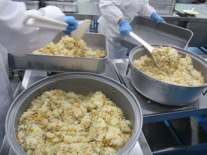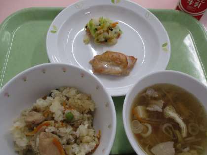 今日は「五目ごはん」です。ごぼう・にんじん・あぶらあげ・しいたけ・鶏肉・グリンピースを使用しています。沢煮椀・照り焼きの肉・和え物の野菜と一緒に美味しくいただけるといいですね。