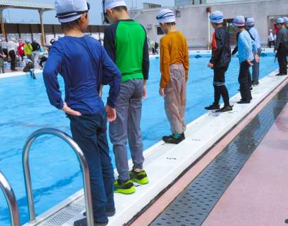 今日は5年生の水泳授業で「命を守る泳ぎ」着衣泳の学習を行いました。川や海、プールなどで溺れてしまった場合、助かる可能性をより高くするためにはどのようにすることが最善か。また、友達や家族がそのような状態になった時にどのように助けるべきか。命を守るための行動を考えました。