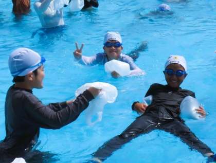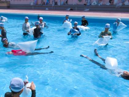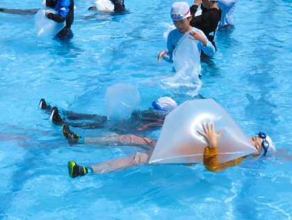 次はビニール袋を抱えて水に浮き、体力を温存しながら救助を待つ等の心構えについて、体験を通して学びました。