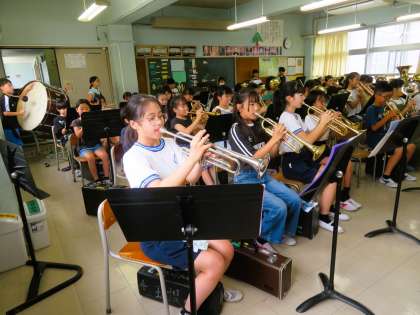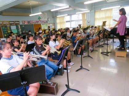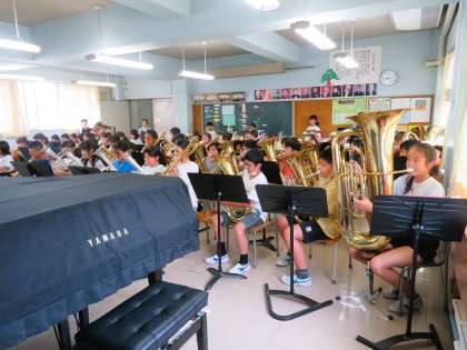 金管バンドは、今週末に迫った「緑陰子ども会」に向けて練習が佳境に入っています。まずは、音階ロングトーンからはじめています。先輩たちがお手本を見せながらのロングトーンです。