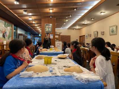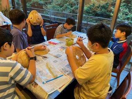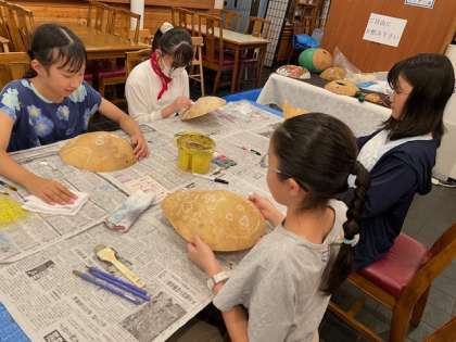 今夜はふくべ細工に挑戦です。ふくべは夕顔の実、干ぴょうのことです。職人さんから作り方の基本を教えていただきました。まず、ふくべにチョークで絵を描きます。