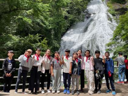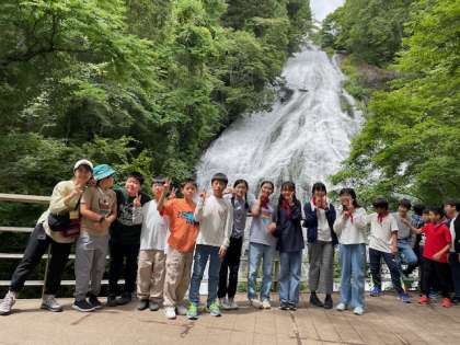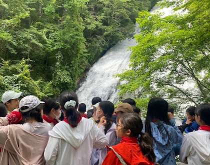 湯滝に到着しました。湯ノ湖から流れ落ちる落差50mの豪快な滝です。