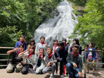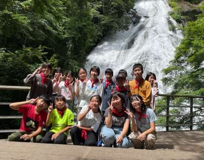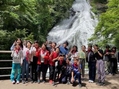 湯滝でグループごとに写真を撮りました。清涼感をみんなで満喫しました!