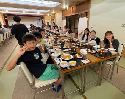 子どもたちは、ホテルの食事に大満足です。話題の多くは、この後の「肝試し」についてです。