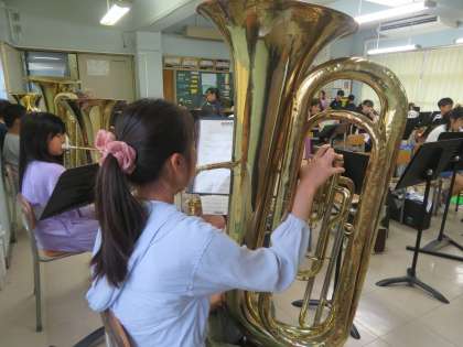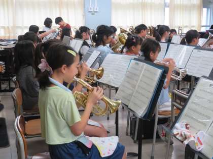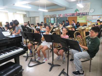 金管バンドは今日から始動です。音楽室に入ると、いつも部長さんをはじめ気持ちのいいあいさつがあり清々しい気持ちになります。今日は、個人練習に取り組んでいます。