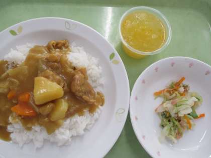 「チキンカレーライス・ツナサラダ・フルーツゼリー」どのクラスも、とても楽しそうに食べていた姿が印象的でした。