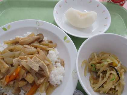 今日は「とりすき丼」です。鶏肉・玉葱・人参・しめじ・こんにゃく・葱・白菜・油揚げを使用して作っています。果物は今が旬の梨にしました、美味しくいただけるといいですね。