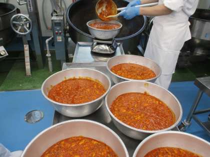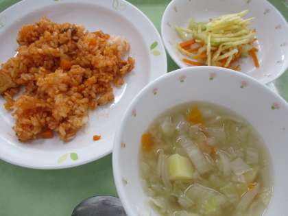 今日は「トマトピラフ」です。玉葱・人参・鶏肉・パセリを使用して、ケチャップ味にして作っています。美味しくいただけるといいですね。