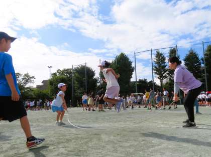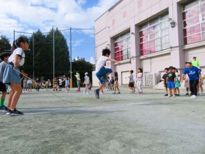 今日の始業前は、夏休み明け初めて2・4・5年生の長縄朝会です。長縄跳びは、学級のチームワークづくり、運動感覚づくりにはとてもよい運動種目なので全校で取り組みます。