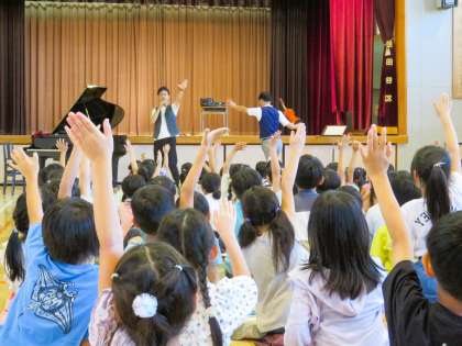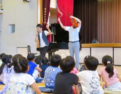 本日、1〜3年生の子どもたちは「ミニコンサート」を体育館で鑑賞しました。プロの演奏家である「エバリー」の方々をお招きして、子どもたちの前でピアノとバイオリンの生演奏を披露していただきました。
