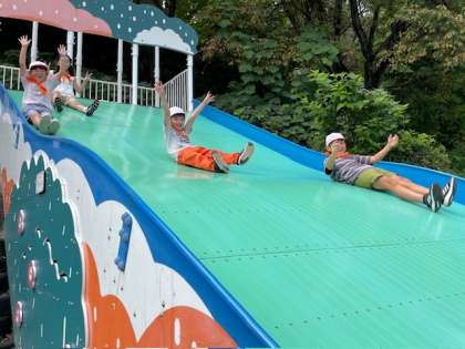 遊具広場「タイムトラベル」で遊ぼうというミッションです。プテラノドンのすべり台です。遊び方が他の学校とは違い豪快です!