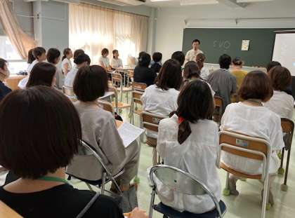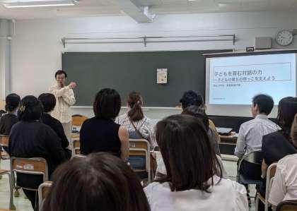 今年度最初の家庭教育学級として、「子どもを育む対話の力〜子どもの育ちを根っこから支えよう〜」をテーマに、上町しぜんの国副園長の青山誠先生をお招きし、講演会を開催しました。「対話ってなに?」「子どもの声ってどう聞くの?」「対話のワーク」など、柔らかく楽しいお話と興味深い話に聞き入ってしまいました。園での子どもたちとのエピソードから子どもの心や声について分かりやすくお話くださり、終始和やかな雰囲気でとても良い講演会でした。
