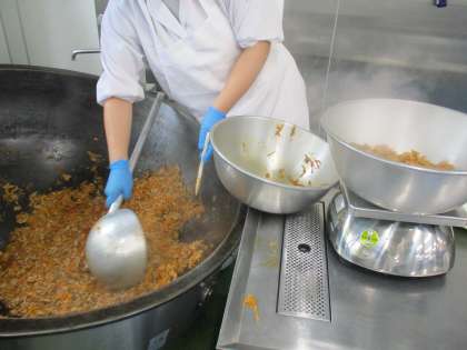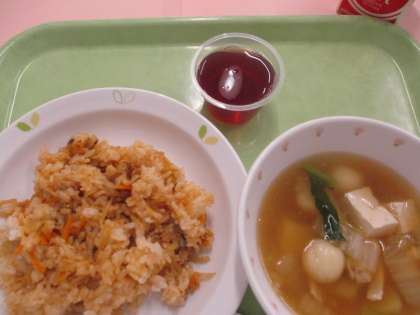 今日は「春雨スープ」です。白菜・葱・じゃが芋・小松菜・豆腐・人参・鶏肉・白玉を使用して作っています。キムタクチャーハンと一緒に美味しくいただけるといいですね。