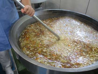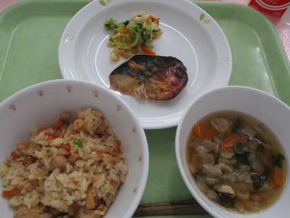 今日は「こぎつねご飯」です。人参・椎茸・油揚げ・鶏肉・グリンピースを使用して作っています。「さばの照り焼き」も美味しく下味がついています、美味しくいただけるといいですね。