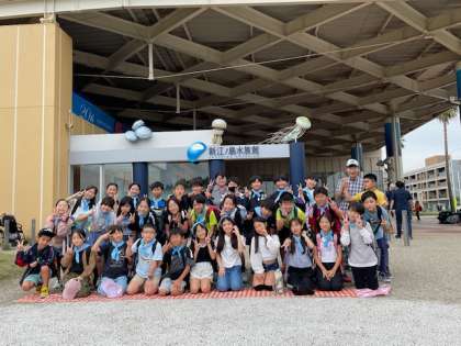 江ノ島や富士山を望むロケーション抜群の水族館前で集合写真を撮りました。