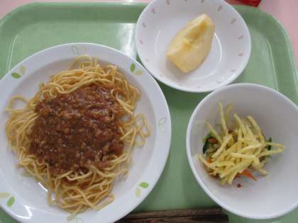 今日は「ジャージャー麵」です。ねぎ・にんにく・しょうが・ひき肉を使用して作っています。りんごの季節になりました。美味しくいただきましょう。