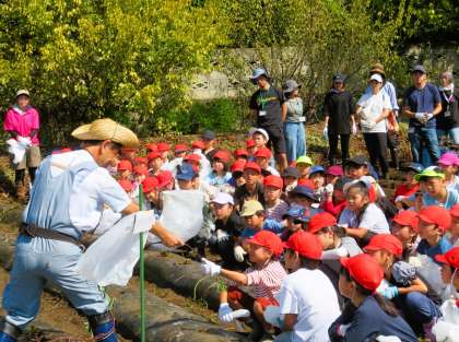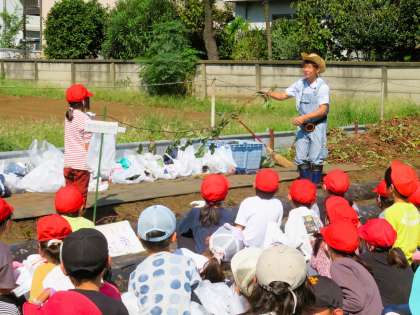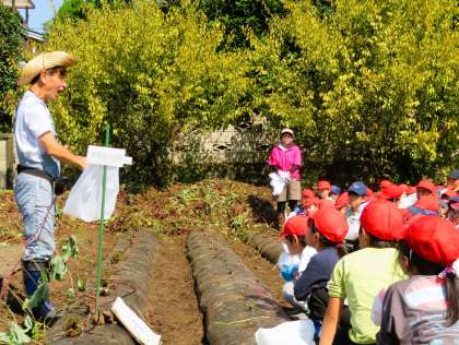 先日、2年生の子どもたちは生活科の学習でさつまいも掘り体験をしてきました。「秋山農園」さんで、今まで大切に育てたおいもです。まずは、さつまいもの掘り方の説明を受けました。