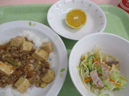 今日は「麻婆豆腐丼」です。ひき肉・ねぎ・玉葱・人参・にんにく・しょうがを使用しています。果物の「みかん」はこれからが旬ですね。まだまだ小さく可愛らしいですが、美味しくいただけるといいですね。