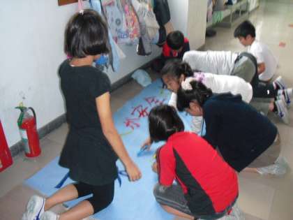 校内を回っていますと、リコーダー練習、読書、係の仕事、おしゃべり・・・などなど色々と工夫して過ごしていました。6年生の廊下で、一生懸命横断幕を作成しているグループに出会いました。「何をしているの」「水泳担当で、みんなで考えためあてを作成しているんです」という答えがかえってきました。プール開きを始まりとして水泳記録会をゴールにしたみんなのめあてをスローガンにしたようです。