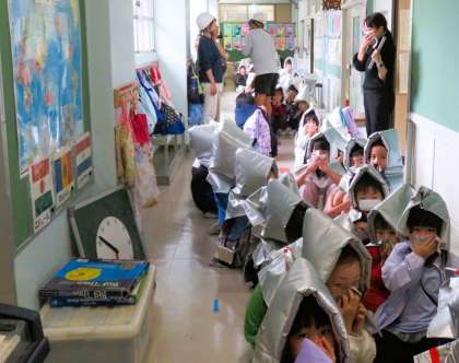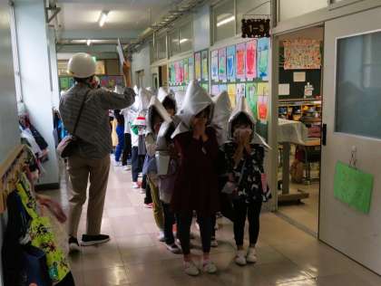 10月の避難訓練は、授業中に家庭科室から出火があり、校舎全体に燃え広がる危険があるため、校庭から第二次避難場所である「弦巻中学校」へ避難するという設定で行いました。子どもたちは「お・か・し・も・ち」の約束を守り一人ひとりが真剣です。