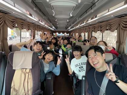 赤城高原サービスエリアに着きました。天候は曇り、高速道路は順調です。バス車内は、バスレクで盛り上がっています。感染症対策として、プラズマクラスター搭載、5分で車内全体が新しい空気に入れ替わる「外気導入運転」を実施しています。