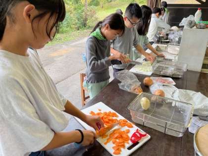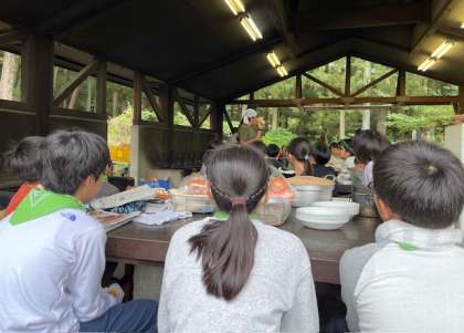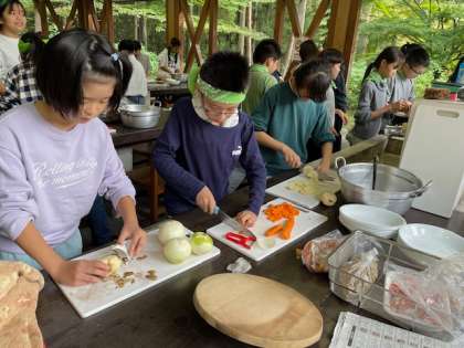屋外炊事場で夕食のカレーライス作りの始まりです。カレーライスの作り方の説明を聞きました。