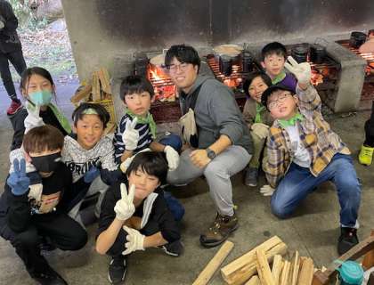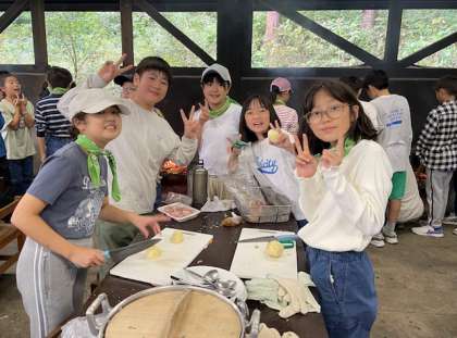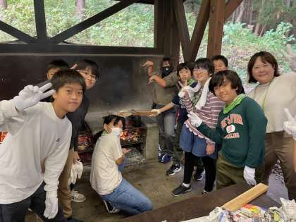 ご飯は飯ごうで炊きます。野外で食事を作ることが初めての子もいますが、友達と楽しそうに調理しています。薪を使って火をおこしたり、野菜や肉を切ったりグループで協力して作っています。美味しいカレーが、もうすぐ出来上がります!
