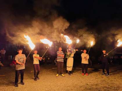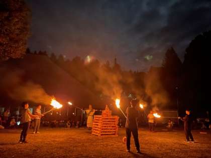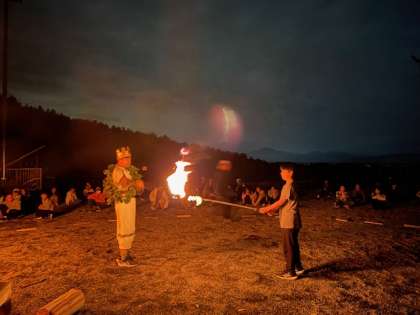 キャンプファイヤーが始まりました。川場の山から降りて来た、火の王様から「団結の火」「切磋琢磨の火」「責任の火」「全力の火」「友情の火」をもらって点火しました。
