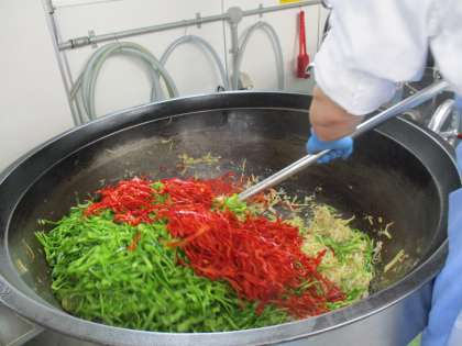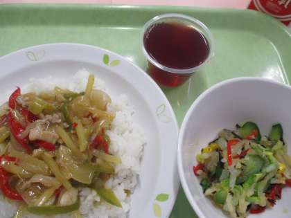 今日は「チンジャオロース丼」です。有機米を使用しています。有機米とは農薬や化学肥料に頼らず水田が本来持っている生産力を引き出して栽培されたお米です。美味しくいただけるといいですね。