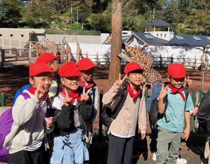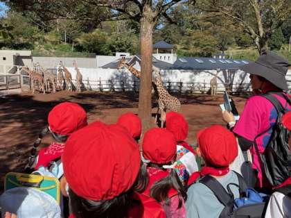 多摩動物公園は、動物を自然に近い環境の中で観察できるよう檻のかわりに壕で仕切るようにしています。野生で群れをつくる動物は、なるべく群れで飼育するようにしています。私も大好きなキリンの様子です!