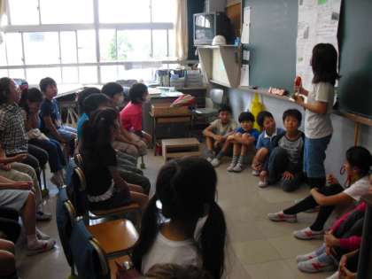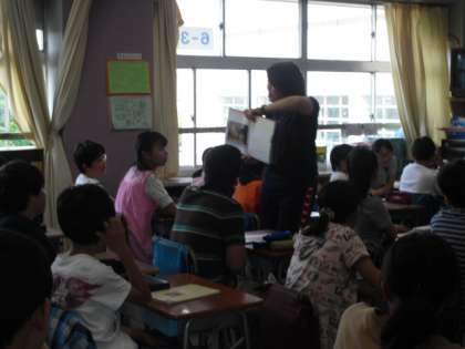 1時間目、5年生が4年生に川場のことを伝える会をしていました。4年生がグループに分かれて5年生の教室へ行き、川場の話を聞きました。農作業のこと、ホタルのこと、リンゴのこと、おおわらじのこと、ナイトハイクのことなどなど