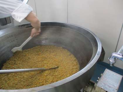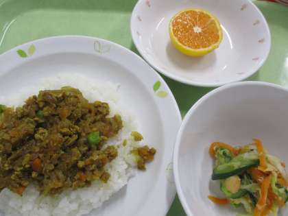 今日は「キーマカレー」です。たまねぎ・にんじん・にんにく・しょうが・グリンピース・豚ひき肉を使用して作っています。白いごはんに合うようにピリッと引き締まった味付けになっています。美味しくいただけるといいですね。