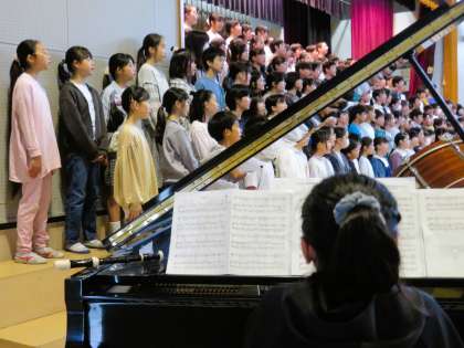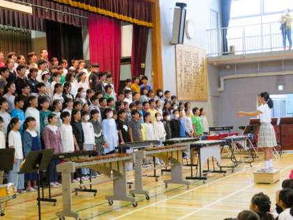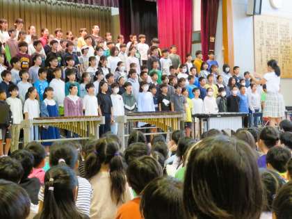 今日の音楽朝会は、6年生の発表を体育館で行いました。曲目は、合唱「COSMOS」、合奏「ハンガリー舞曲第5番」です。