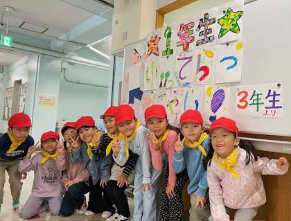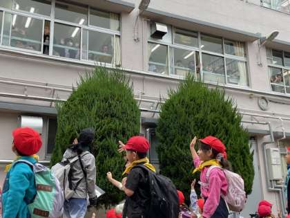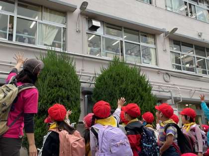 学校を出発するときに、上級生や先生たちが「いってらっしゃーい!」と、温かく手を振って見送ってくれました。3年生からは「いってらっしゃい!」の掲示物もありました。