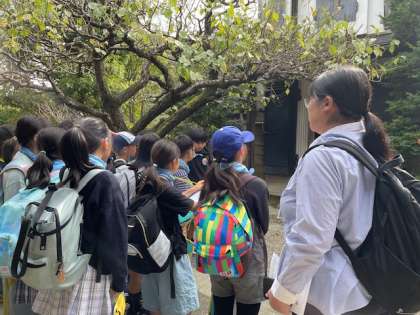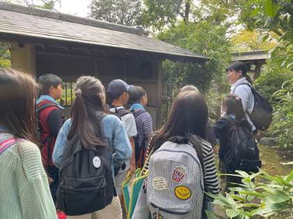 館外に出て昔の人々の暮らしの様子が分かる施設を見学しました。明治天皇が府中および近辺に来られたときには、休息や宿泊所として使用していた旧田中邸です。広々とした和室のお部屋がいくつもあり、茶室や蔵、綺麗なお庭もありました。