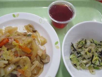 今日は「だいこんとひじきのサラダ」です。ひじきには、骨を強くするカルシウムや腸を綺麗にする食物繊維が多く含まれています。皮膚を健康に保つビタミンAも含まれています。美味しくいただけるといいですね。