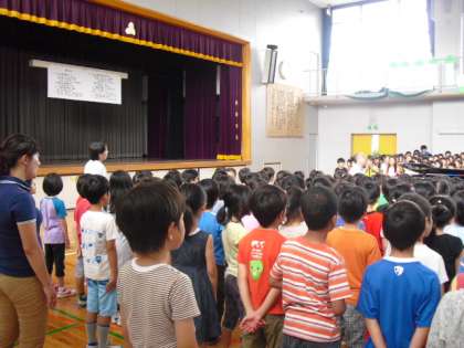 梅雨空の蒸し暑い朝です。校庭で思い切り遊んでいた子どもは、汗だくで体育館へ集合しています。