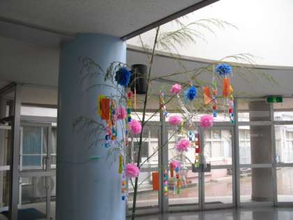 キッズトレインとは、地域運営学校の取り組みの一つで、未就園児を対象にした活動です。今日は、笹かざりづくりに取り組んでいました。笹は、地域の方からいただいています。