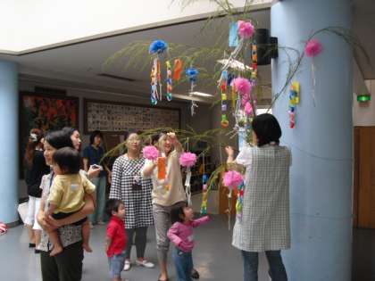 親子で飾りを作り、自分の枝を決めて飾り付けをします。活動終了後には、枝を切ってもらい、一人一人持ち帰りました。飾りつけの終わった笹の前で写真をとる親子がいました。
