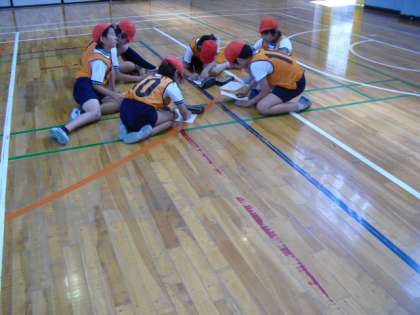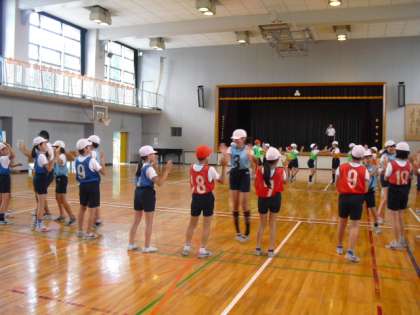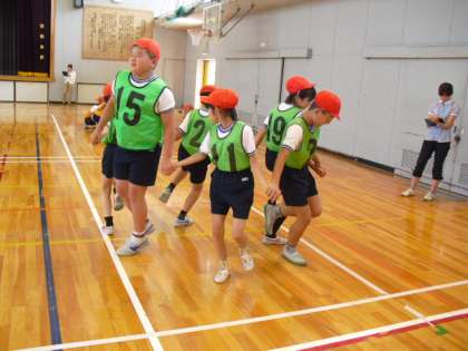そのあと、ジャンピングあんたがたどこさを行いました。「さ」の時に左へ移動という決まりのもと、グループで工夫して取り組みました。そして大根抜き。学級を2つに分けて抜かれないように必死になっている子どもたち。