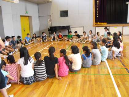 体育館では、企画代表委員会が6年生に遊びを教えるということをしていました。雨の日に室内で安全にかつ楽しく遊べる遊びを順番に各学年の紹介し、雨の日の安全な過ごし方を広めようという試みのようです。今紹介している遊びは「字数しりとり」「キャッチ」でした。