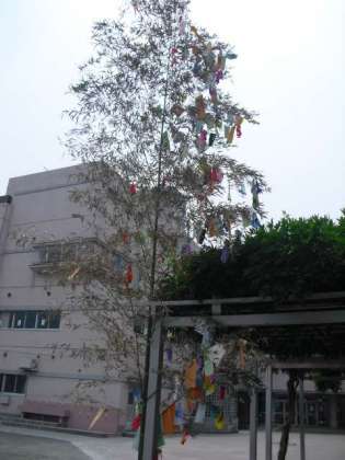 近隣の方のご厚意でいただいている笹です。とても立派な笹で校庭に飾っています。1年生が思い思いに願いを書き、飾りをつけていきました。