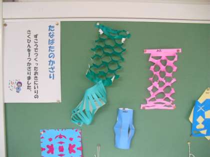 1年生は図工の時間にお気に入りのかざりを作成しました。長くつなげる工夫をしたり、折り紙の切り方で模様が変わったりすることを学習していきます。そこで作った飾りを大きな笹に飾りました。