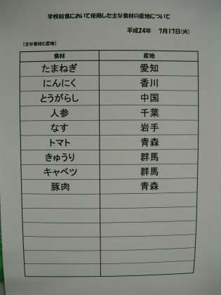 7月17日(火)本日の給食産地