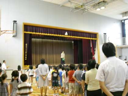 始業式の私の話は、2つのことを目標に2学期を過ごしてほしいという願いを伝えました。一つは「最後まであきらめないこと」です。24時間テレビの話題を取り上げ、自分の目標に向かって、人と比べるのではなく最後まであきらめないがんばりをしてほしいという気持ちを伝えました。2つめは、「がまくんのてがみ」です。国語の教科書にも取り上げられている「お手紙」を紹介し、是非、この手紙離れの時代に、手紙を書くことをしてほしいこと、もらった手紙に返事をすることを話しました。日ごろ口では伝えにくいことも手紙で伝えるということもしてほしいと・・・