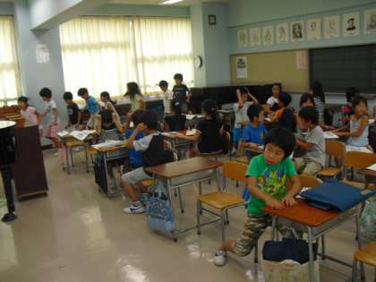2年生の音楽授業です。「いるかはざんぶらこ」の曲が流れると子どもたちは自然に手拍子したり体を動かしたり始めました。「まだ。もう少し座っていて」という先生の指示に座席につきますが、早く動きたい気持ちでいっぱいのようです。