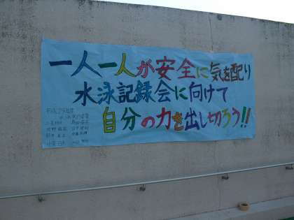 『一人一人が安全に気を配り 水泳記録会に向けて自分の力を出し切ろう!!』という横断幕を掲げ、気合いが一層入りました。
